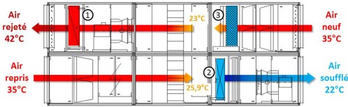 – Intersaison : Quand la température de l’air extérieur est légèrement au-dessous de celle de consigne: la CTA fait un échange entre l’air repris et l’air neuf rafraîchi après avoir traversé un échangeur adiabatique.
